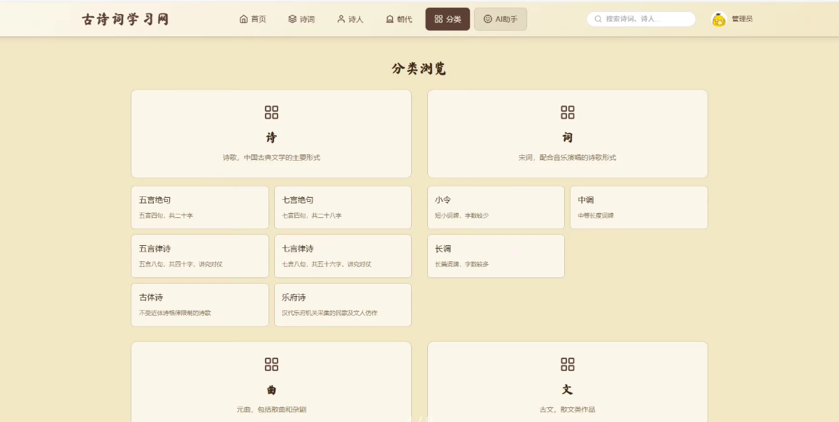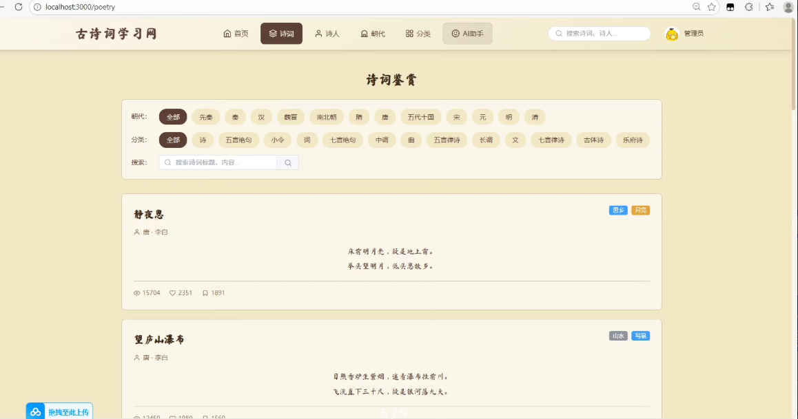 总而言之,本项目不仅是一个静态的“诗词数据库”,更是一个以AI为特色、以用户体验为核心的动态、交互式智慧学习生态系统。它通过技术赋能,让古老的诗词在现代数字世界中焕发新的活力,使学习过程更主动、更深入、更具吸引力。