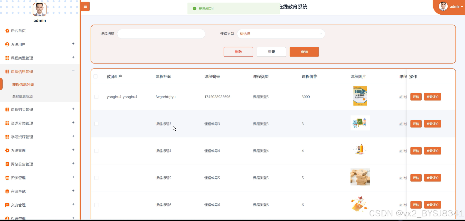 6. 在线考试(试题库、试卷列表):管理考试题库,生成试卷,设置考试内容和时间。