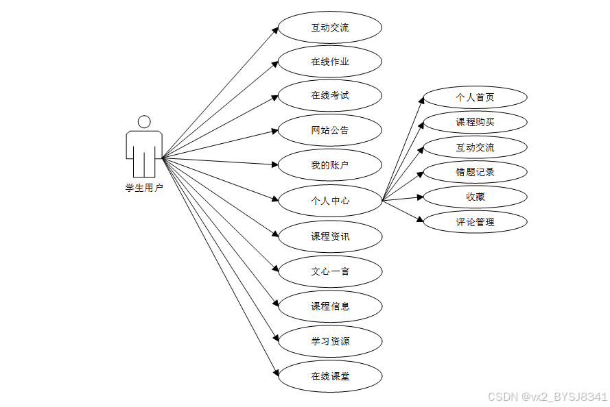 系统功能需求分析包括学生、教师和管理员三个角色的需求。对于学生,系统需要提供个性化的学习推荐、在线作业和考试、学习进度跟踪以及学习资源的访问。教师需要能够管理课程内容、布置作业、批改作业、监控学生学习进度,并提供互动交流功能。管理员则需要管理系统用户、课程信息、公告发布、数据分析以及权限设置等功能。此外,系统还应具备高效的数据处理能力,确保用户体验流畅并支持大规模并发访问。具体功能如下: