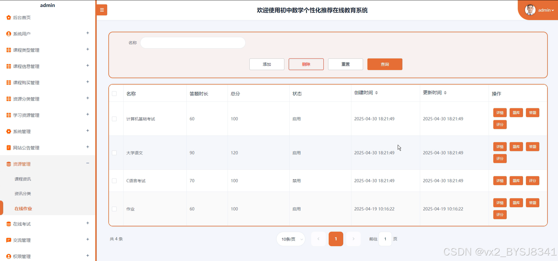 5. 资源管理(在线作业):创建、发布、管理在线作业,并查看学生的提交情况。