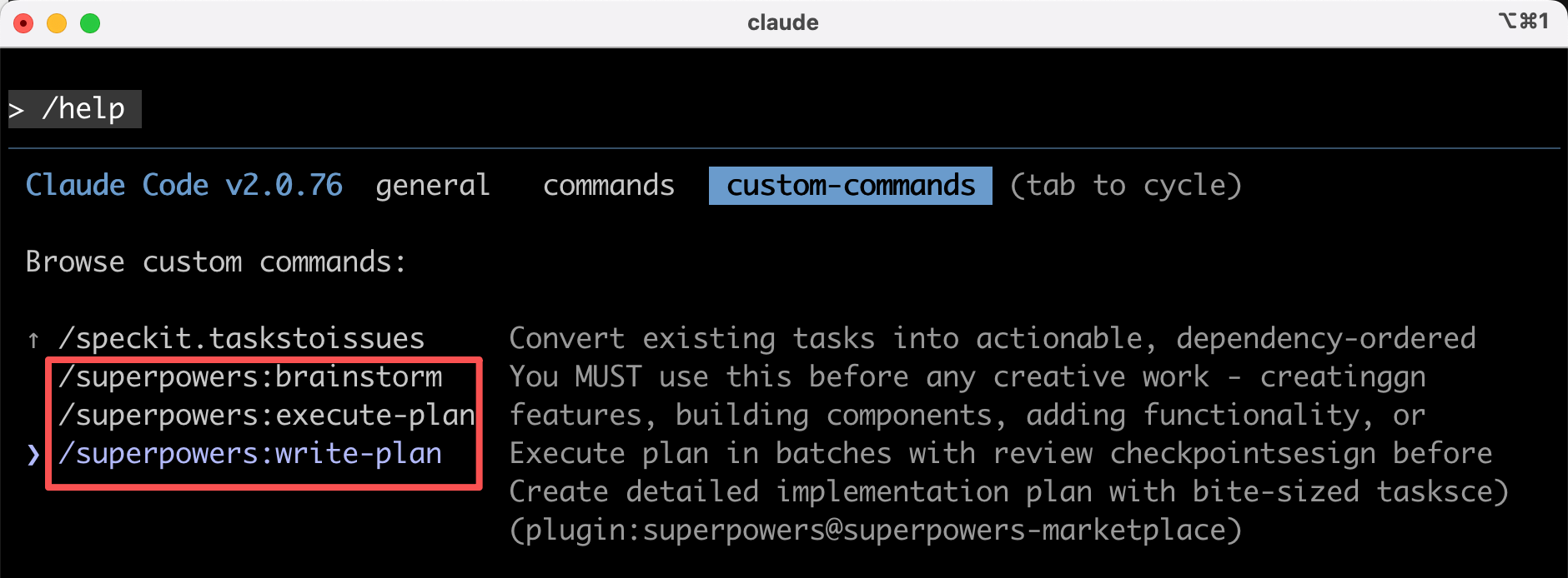 安装后运行 /help 查看可用命令,你会看到这 3 个命令