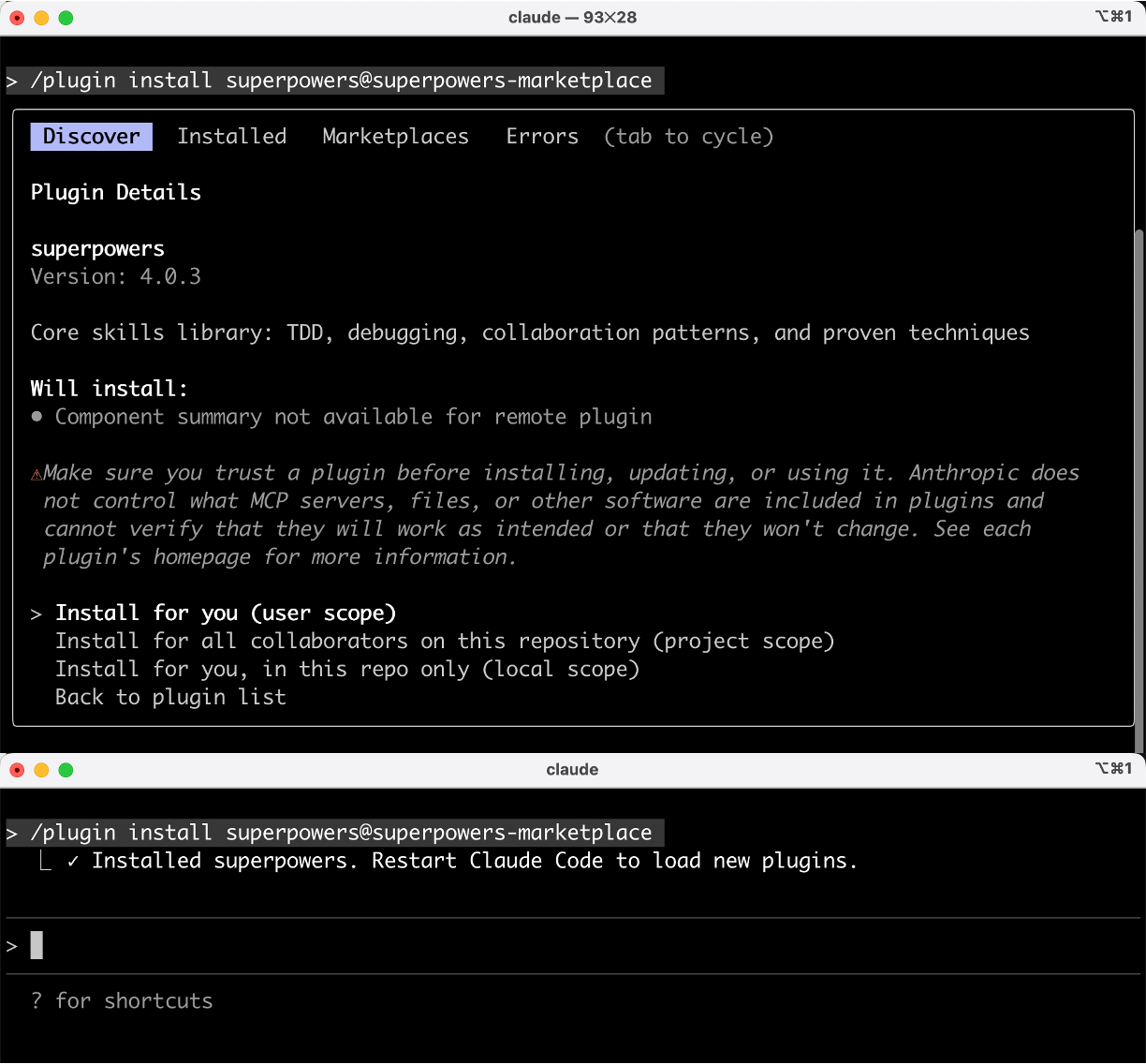 参考 Superpowers 官方文档,在 Claude Code 中运行以下命令安装。