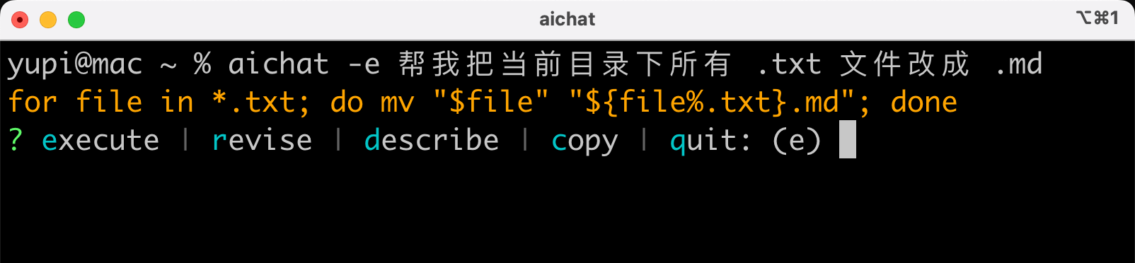 用了 AIChat 后,你只需要在终端中说人话,它的 Shell 助手 能力就会把你的自然语言自动转换成准确可执行的命令。
