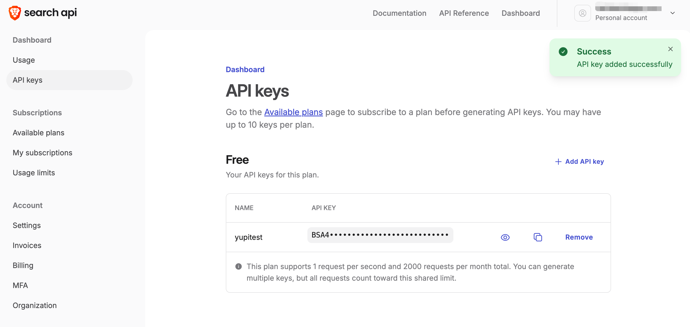 订阅成功后,创建 API Key: