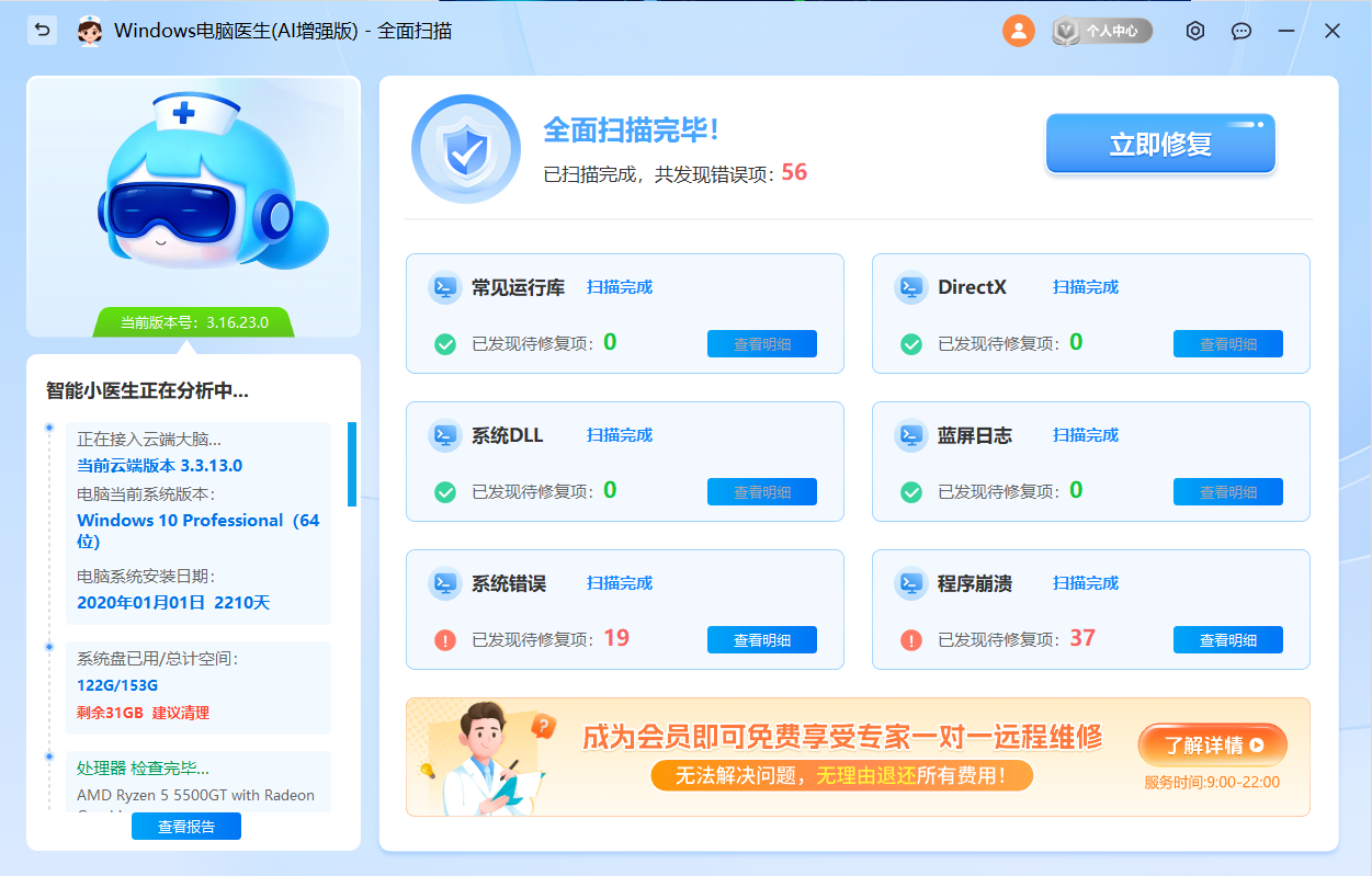官方级修复方案,小白式一键操作。2分钟全面扫描,精准定位DLL丢失、运行库损坏、注册表错误等核心问题,无广告骚扰,无后台驻留。