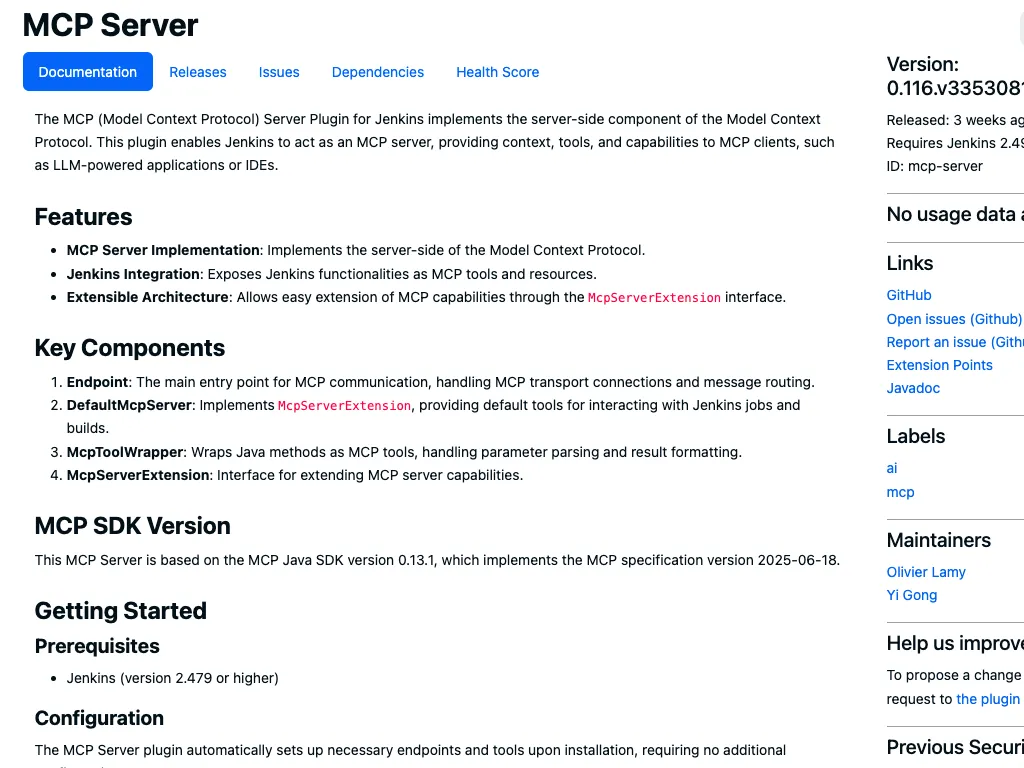 - 官方文档/项目地址:https://plugins.jenkins.io/mcp-server/