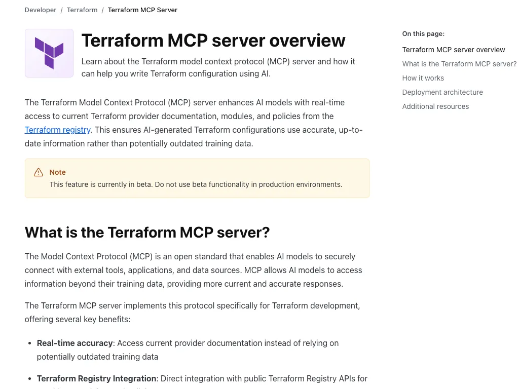 HashiCorp 官方发布的 Terraform MCP 服务器,为 Terraform 配置管理引入了 MCP 支持。该服务器让 AI 模型实时访问 Terraform Registry 中提供商的文档、模块和策略,从而生成准确的 Terraform 配置,而不是依赖过时的训练数据。HashiCorp 文档指出,Terraform MCP 服务器集成了公共 Registry 的 API,支持查找模块输入输出、引用 Sentinel 策略,并且可以管理 Terraform 云(HCP/TFE)组织和工作区。