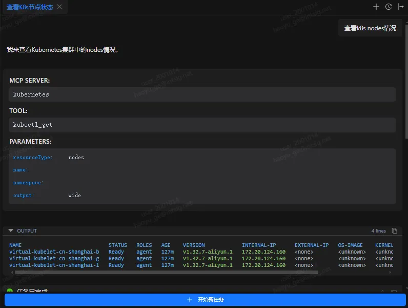 - 功能与适用场景: AI 可以查询资源状态(如 pod 列表、节点指标),部署新服务或扩展现有部署,甚至执行复杂的故障排查。示例场景包括“检查命名空间内有哪些异常 Pod”“帮我滚动重启某个 Deployment”之类。