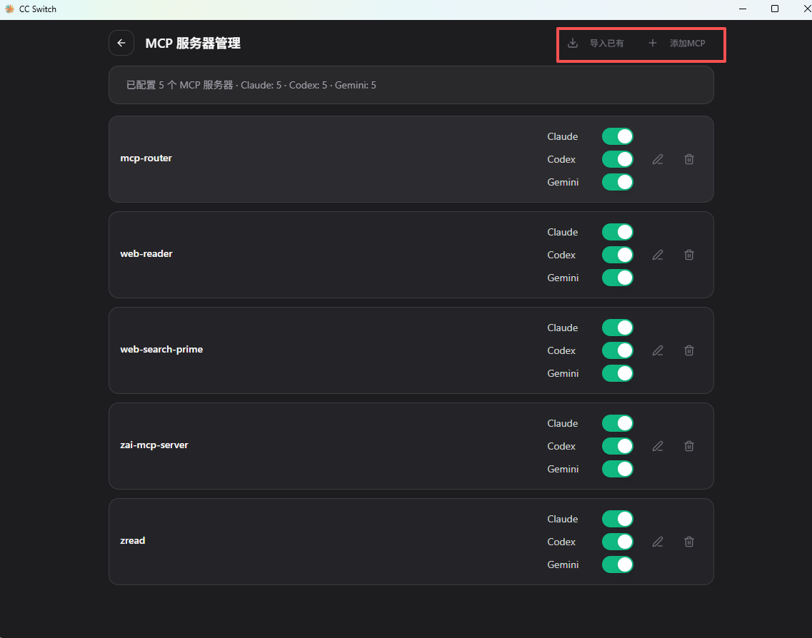 在 MCP 服务器列表中,每个服务器右侧都有一个开关按钮:
