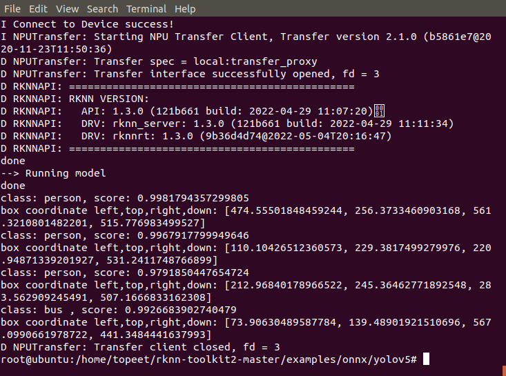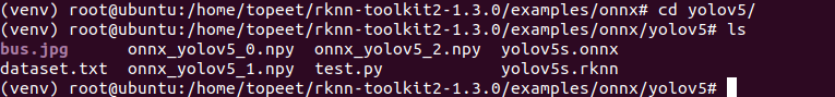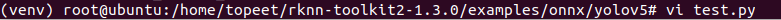 4 进入到examples/onnx/yolov5文件夹,输入以下命令,执行模型转换和推理模型的test.py脚本。