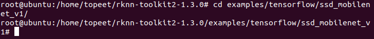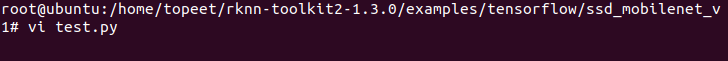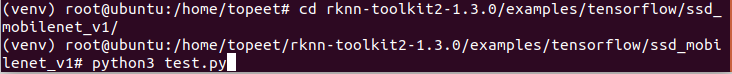 3 进入到examples/tensorflow/ssd_mobilenet_v1/文件夹,输入以下命令,执行模型转换和推理模型的test.py脚本。