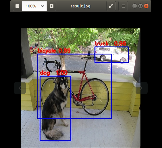 6 完成推理后我们可以得到一个results.jpg。打开后发现里面有推理后的结果,包括被识别的物体和对应的置信度。