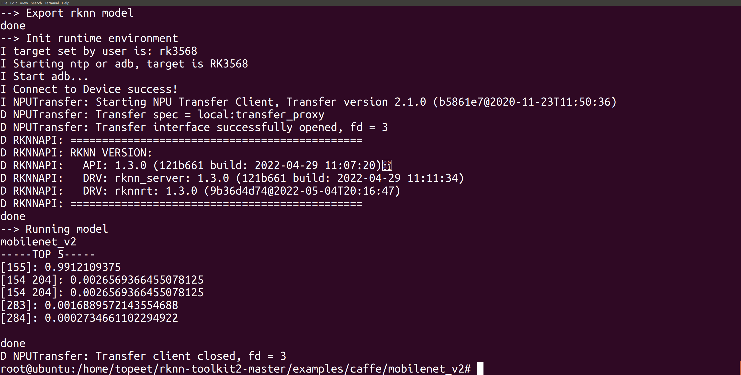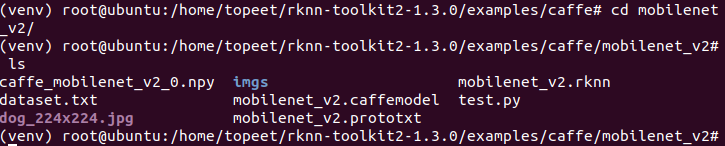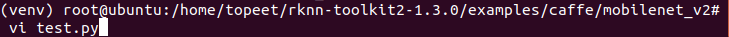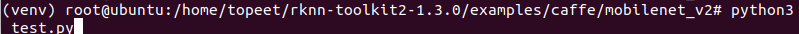 4 进入到examples/caffe/mobilenet_v2文件夹,输入以下命令,执行模型转换和推理模型的test.py脚本。