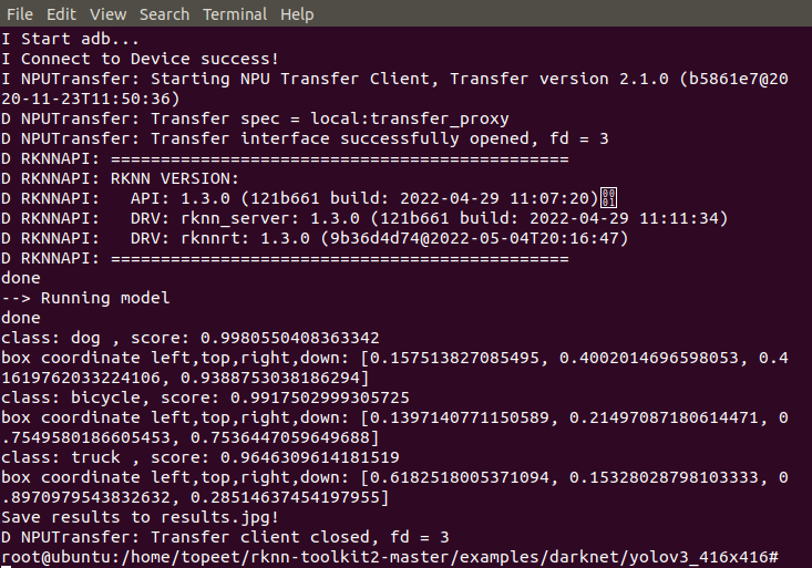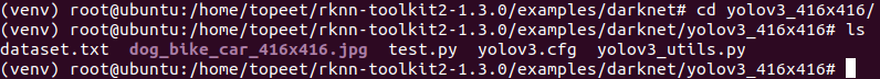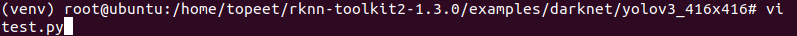 4 进入到examples/darknet/yolov3_416x416文件夹,输入以下命令,执行模型转换和推理模型的test.py脚本。