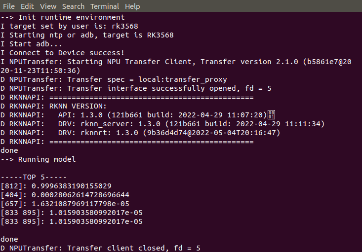 本章节我们测试并运行这些demo程序,模型运行在RK3568开发板上,开发板上烧写android11系统,运行环境可以参考5.3.2章节进行搭建,这里只给出转换模型的步骤。