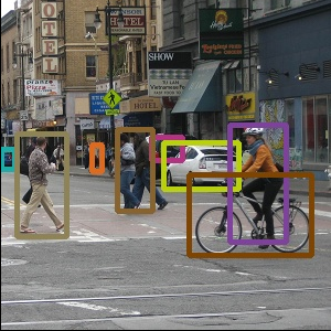 5 如上图所示,Score反映的是得分,得分越高说明和被认为的标签相似度越高,圆括号则是对应识别出的物体的坐标。命令行中出现了八行被识别物体的坐标和置信度,和out.jpg可以对应。out.jpg如下图所示: