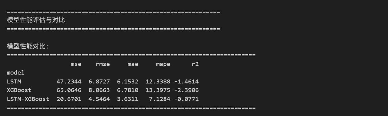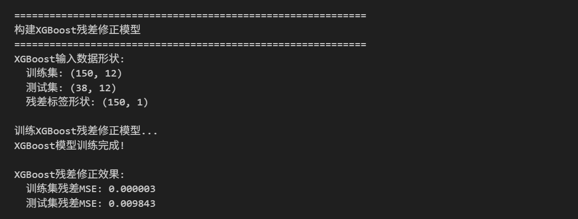 - XGBoost进行残差修正:将LSTM的预测残差作为XGBoost的学习目标,捕捉LSTM未能拟合的非线性关系