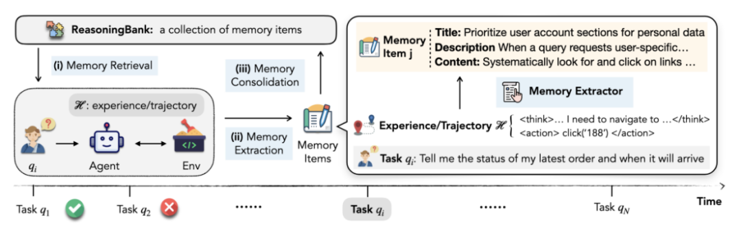 闭环机制: ReasoningBank运行过程中,每个任务都经历**“检索-执行-提炼-更新”**的闭环: