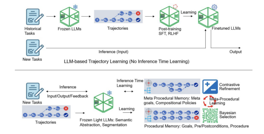 - 而 MACLA [4]则把“运行时闭环”推进到更结构化的层级:在冻结LLM的前提下,引入外部层级程序记忆,用贝叶斯效用选择在多候选技能中做可靠性—探索权衡,并通过成功/失败的对比式精炼不断修正程序的适用条件与步骤,从“记住文本”走向“记住怎么做”,把记忆闭环落到可组合、可解释的技能层面。