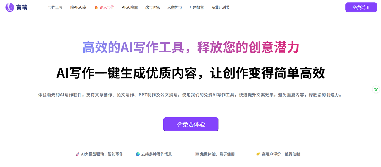 言笔算是一个AI写作平台,写作、润色、降ai都有。但有时候吧,它会过度解读,把你原文的意思给改偏了,特别是专业术语,用完必须自己重头检查一遍。