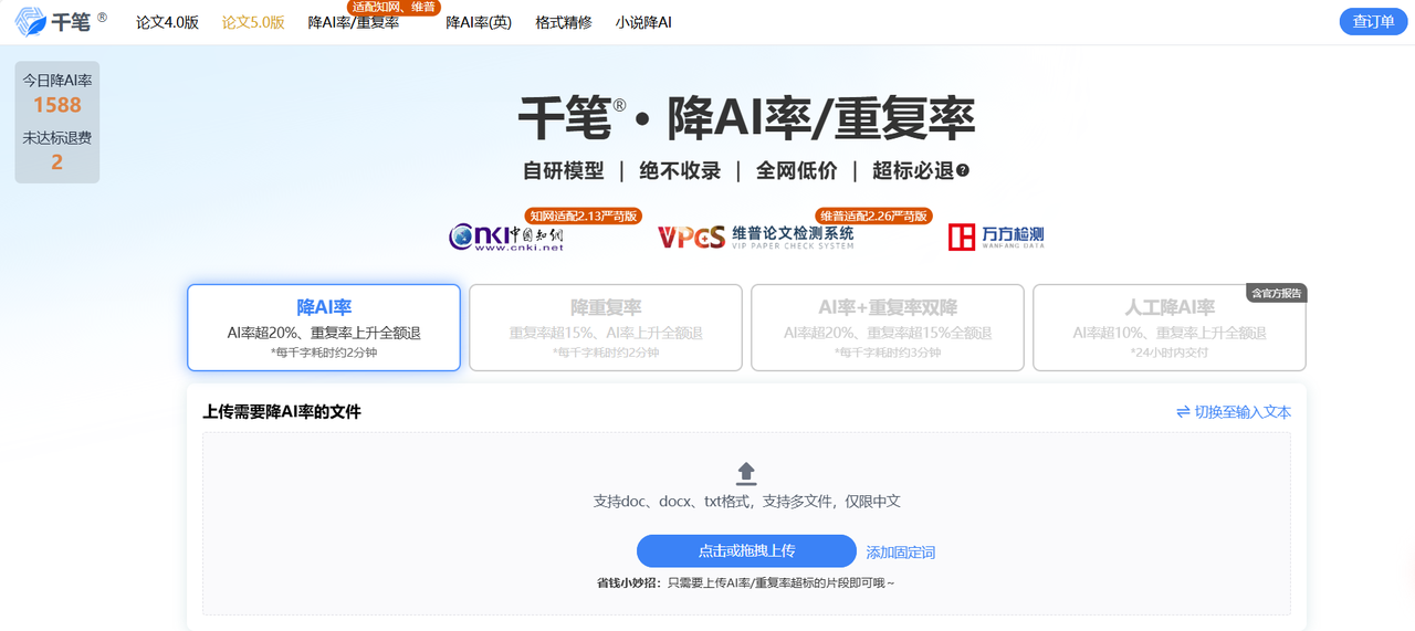 这又是一个查重系选手。用它降ai,效果时好时坏,非常不稳定。你第一次降可能AIGC率到10%了,第二次用同样的内容,可能还是50%。