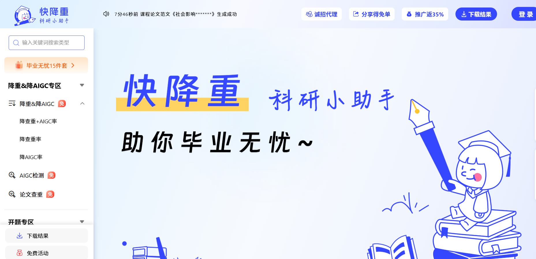 我将这份“危重样本”上传至“快降重”,直接选择其可能最强的降AI模式(根据官网描述及推测)。整个过程无异于一场紧张的抢救。
