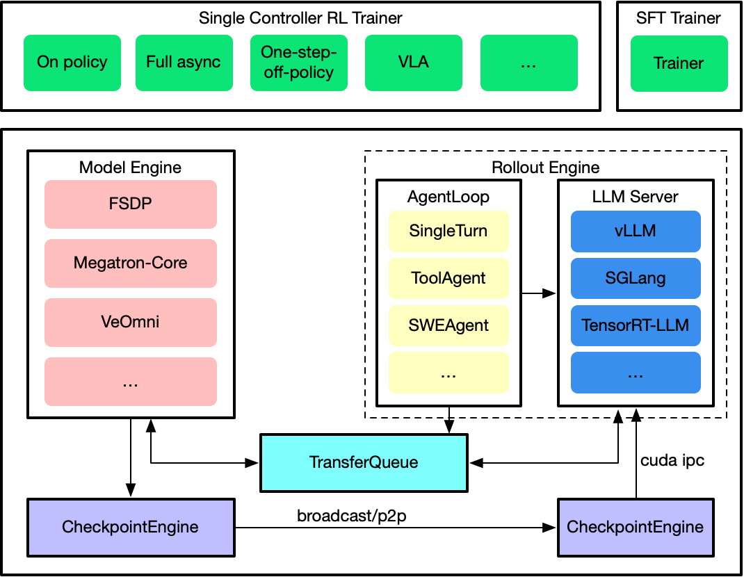 - 后端多样性: 除了Megatron,verl也支持PyTorch FSDP和FSDP2,为Hugging Face模型用户提供了灵活性。
