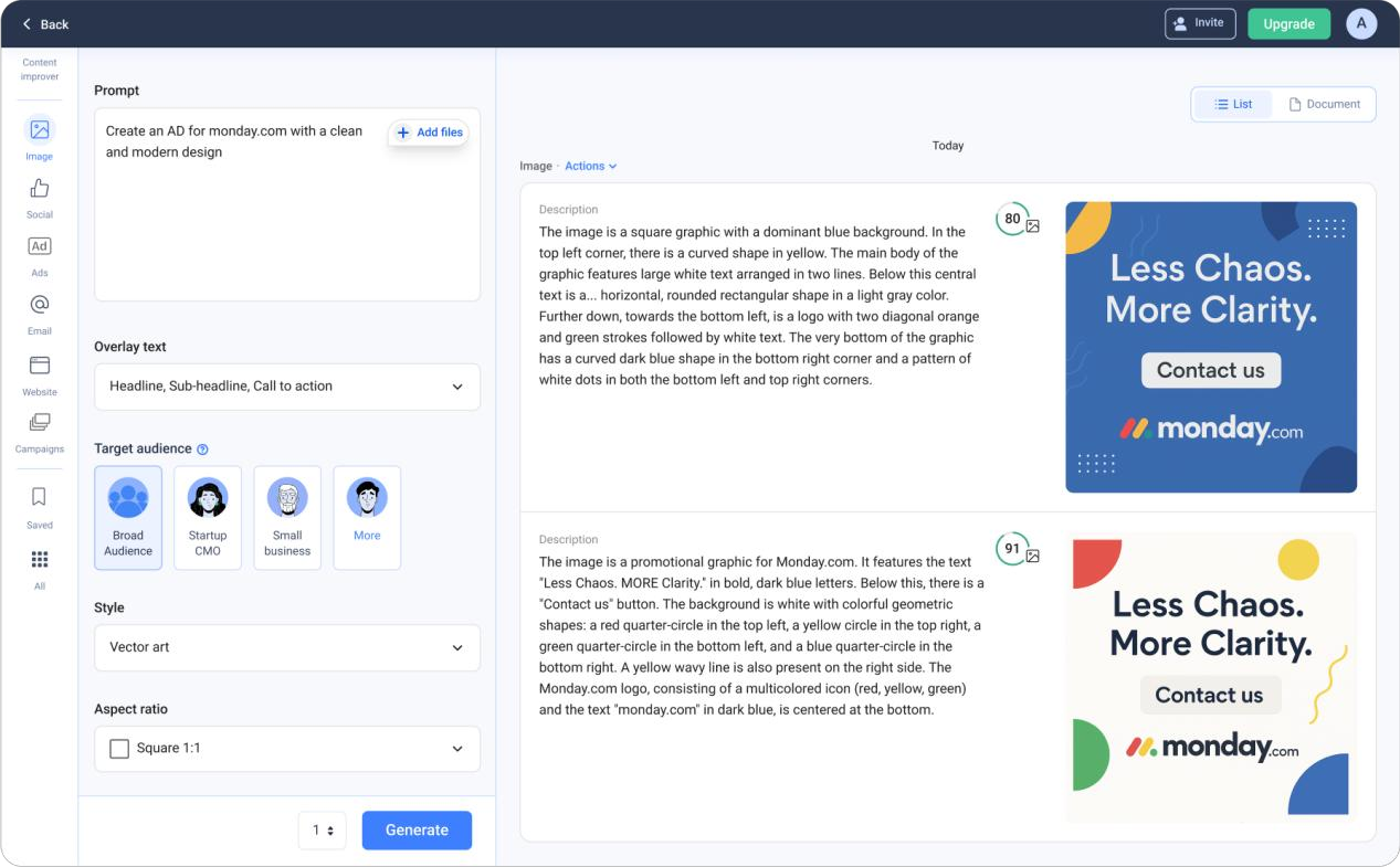 在生成方面,Anyword当然具备常规AI写作助手功能(包括博客生成、广告语生成等),但其独特之处在于每次生成都会附带效果评分,让用户“用数据选文案”。此外,Anyword推出了Website AI文案自动化功能,支持网站上的文案实时个性化:根据访问者属性自动替换成预测最有效的版本,类似A/B测试的智能升级版。技术上,Anyword引入检索增强生成(RAG)架构,将企业自有数据与LLM结合,从而实现输出内容对品牌和业务更具针对性。其模型训练部分来源于Keywee多年积累的新闻/广告测试数据,以及自主抓取的公开素材,避免涉及版权内容。这些举措保证了Anyword生成内容的可靠性和品牌一致性。