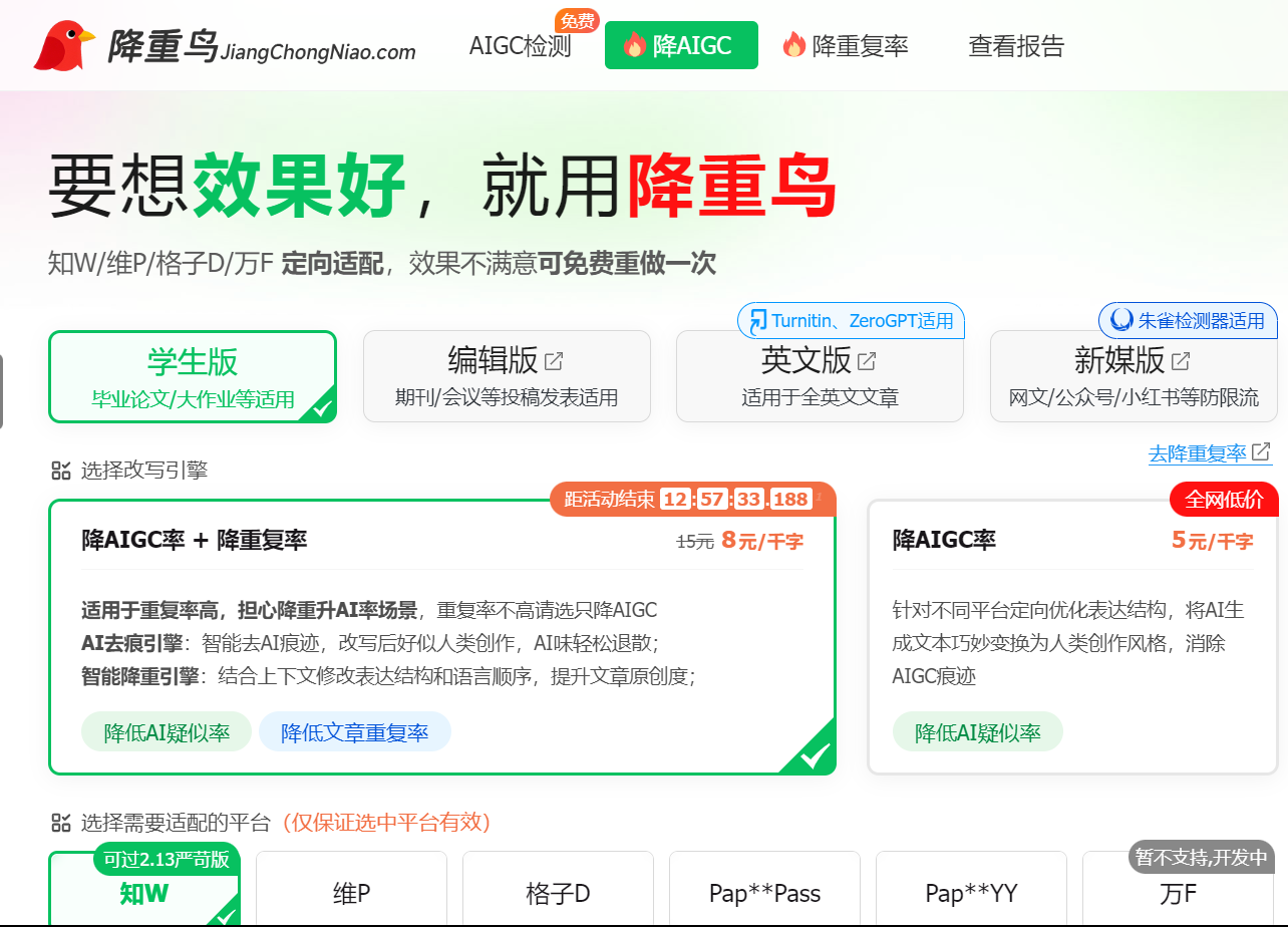 不要迷信“免费”: 真正好用的降ai模型,算力成本都很高。市面上那些打着“永久免费”旗号的,要么是引流,要么就是用最差的模型敷衍你,改完AI率可能反而更高。