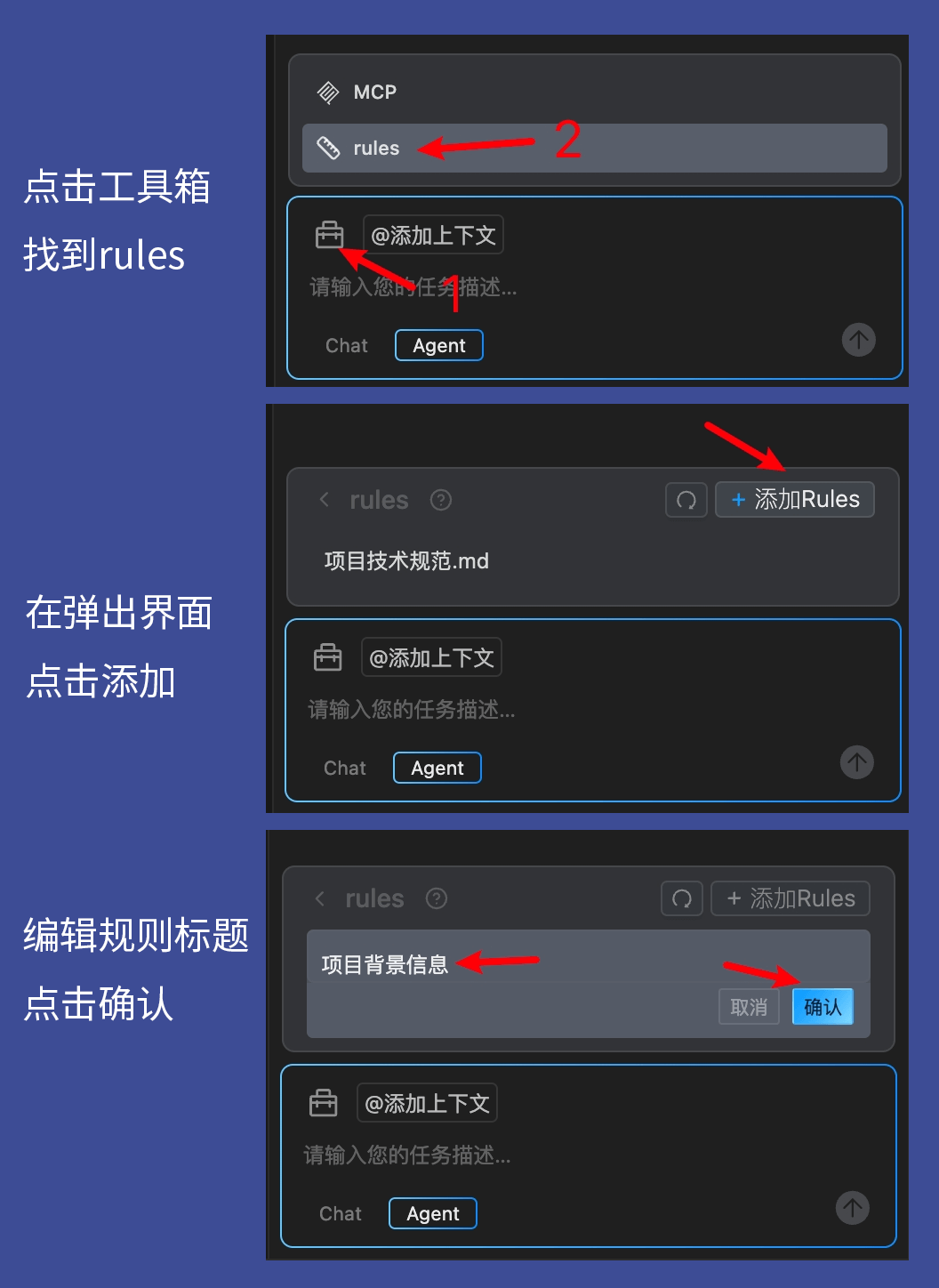 添加 rules 后,会自动出现 Rules 文件编辑界面,在此处写入文字,每次调用 Agent 智能体时,智能体将自动读取已写好的 rules 文件。进而增强对当前整个项目的理解能力,生成更规范、符合项目要求的代码和回答。