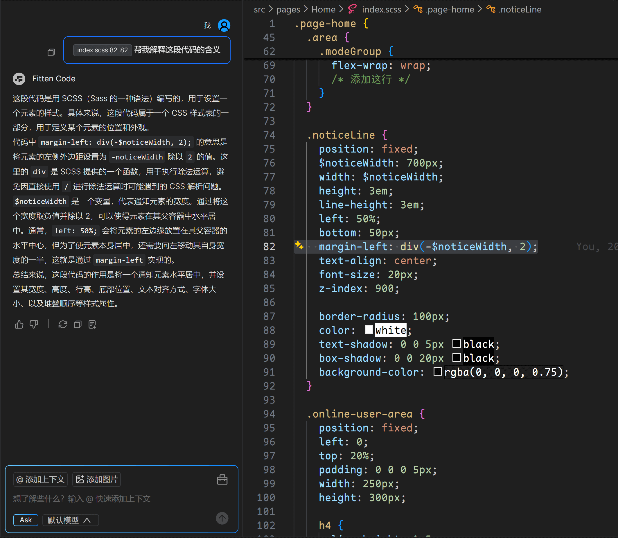 当用户选中文件中的代码段再进行对话时,Fitten Code 会自动引用用户所选中的代码段,此时可直接针对该代码段进行问询等操作: