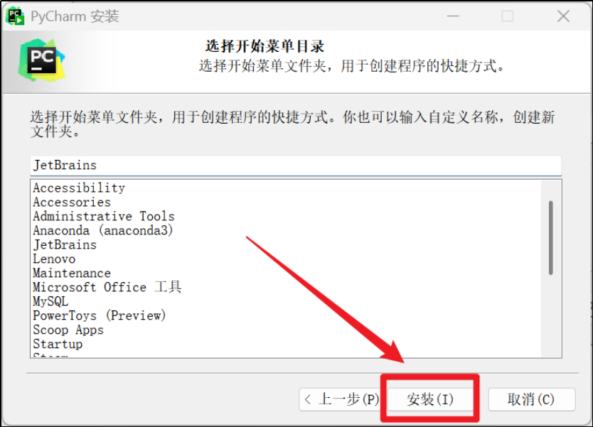 选择开始菜单文件夹(保持默认即可),点击 "Install" 开始安装。