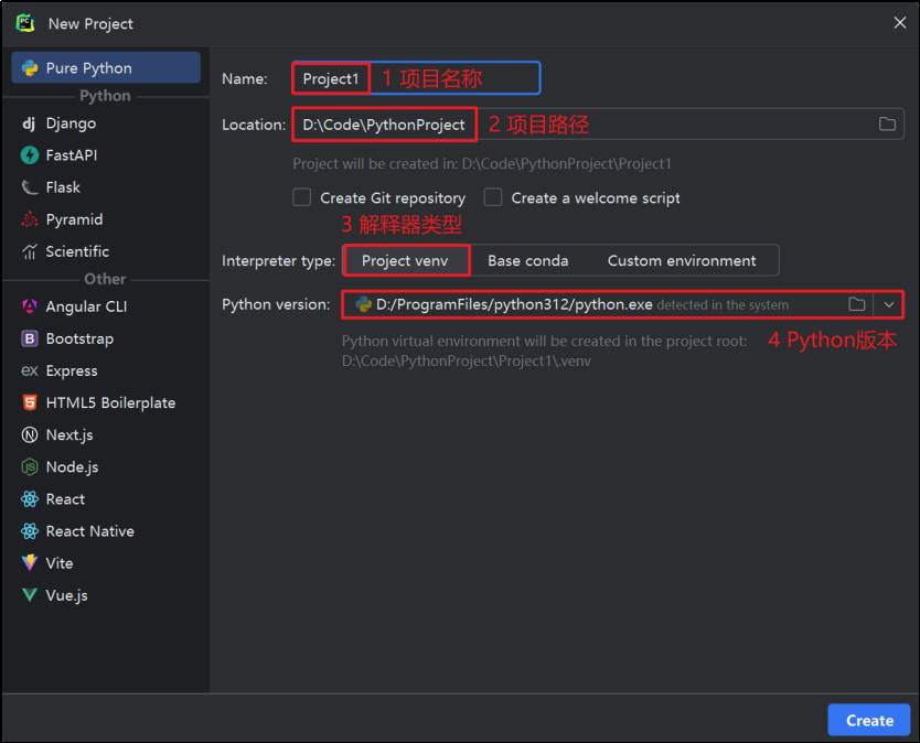 如果之前正确安装了 Python,PyCharm 通常会自动检测到它,并选择 "New environment using Virtualenv"。这是推荐的做法,它为每个项目创建独立的虚拟环境,避免包管理混乱。
