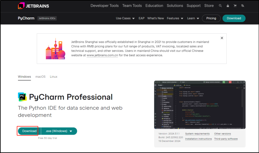 打开 PyCharm 官方网站:https://www.jetbrains.com/pycharm/