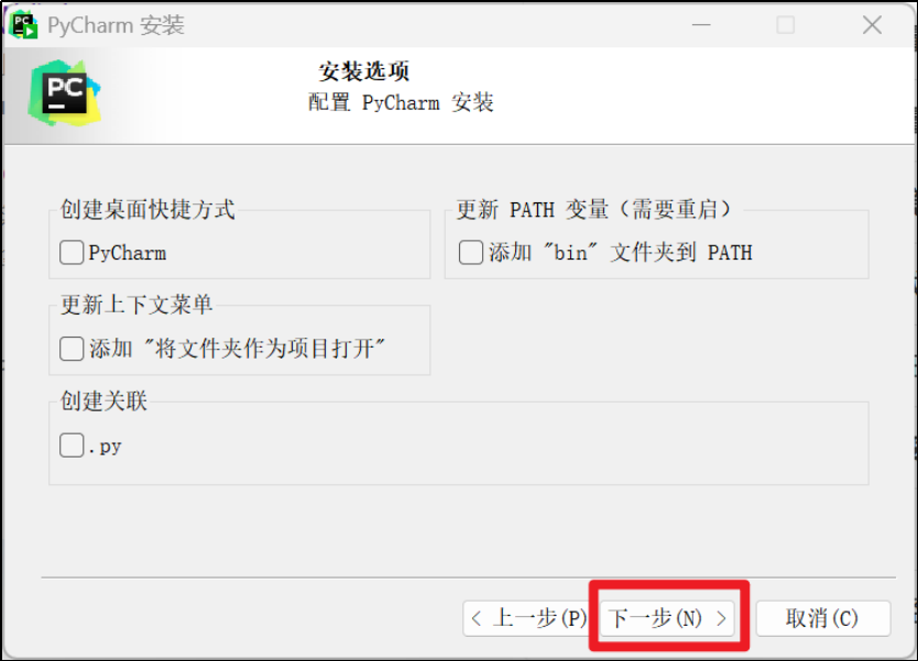 Create Associations(创建关联):推荐勾选.py,将 PyCharm 设置为默认的 Python 文件编辑器。
