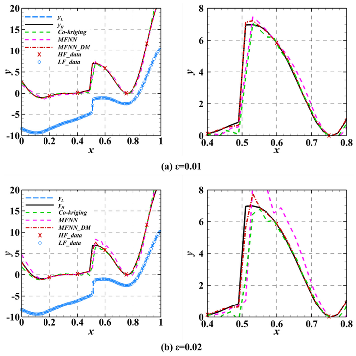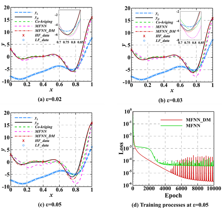 首先,我们验证了传统MFNN方法与所提出方法在数值算例上的差异。不同于传统数值算例,我们在高、低精度数据之间引入了位置偏差,以模拟趋势的不一致对建模能力的影响。模型的训练误差过程如图3(d)所示,差分关系允许模型更灵活地选取关联方式,这显著提高了模型的训练精度。针对间断问题的预测结果如图4所示。
