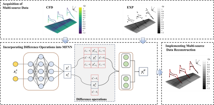 基于上述分析,我们在传统MFNN中融入了差分方法层,由此构建的模型称为"基于差分法的多精度神经网络"(MFNN_DM)。图2展示了所提出的多源气动数据重构方法。