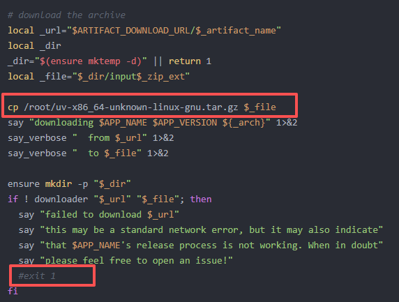 …… # download the archive local _url="$ARTIFACT_DOWNLOAD_URL/$_artifact_name" local _dir _dir="$(ensure mktemp -d)" || return 1 local _file="$_dir/input$_zip_ext" cp /root/uv-x86_64-unknown-linux-gnu.tar.gz $_file say "downloading $APP_NAME $APP_VERSION ${_arch}" 1>&2 say_verbose " from $_url" 1>&2 say_verbose " to $_file" 1>&2 ensure mkdir -p "$_dir" if ! downloader "$_url" "$_file"; then say "failed to download $_url" say "this may be a standard network error, but it may also indicate" say "that $APP_NAME's release process is not working. When in doubt" say "please feel free to open an issue!" #exit 1 fi ……