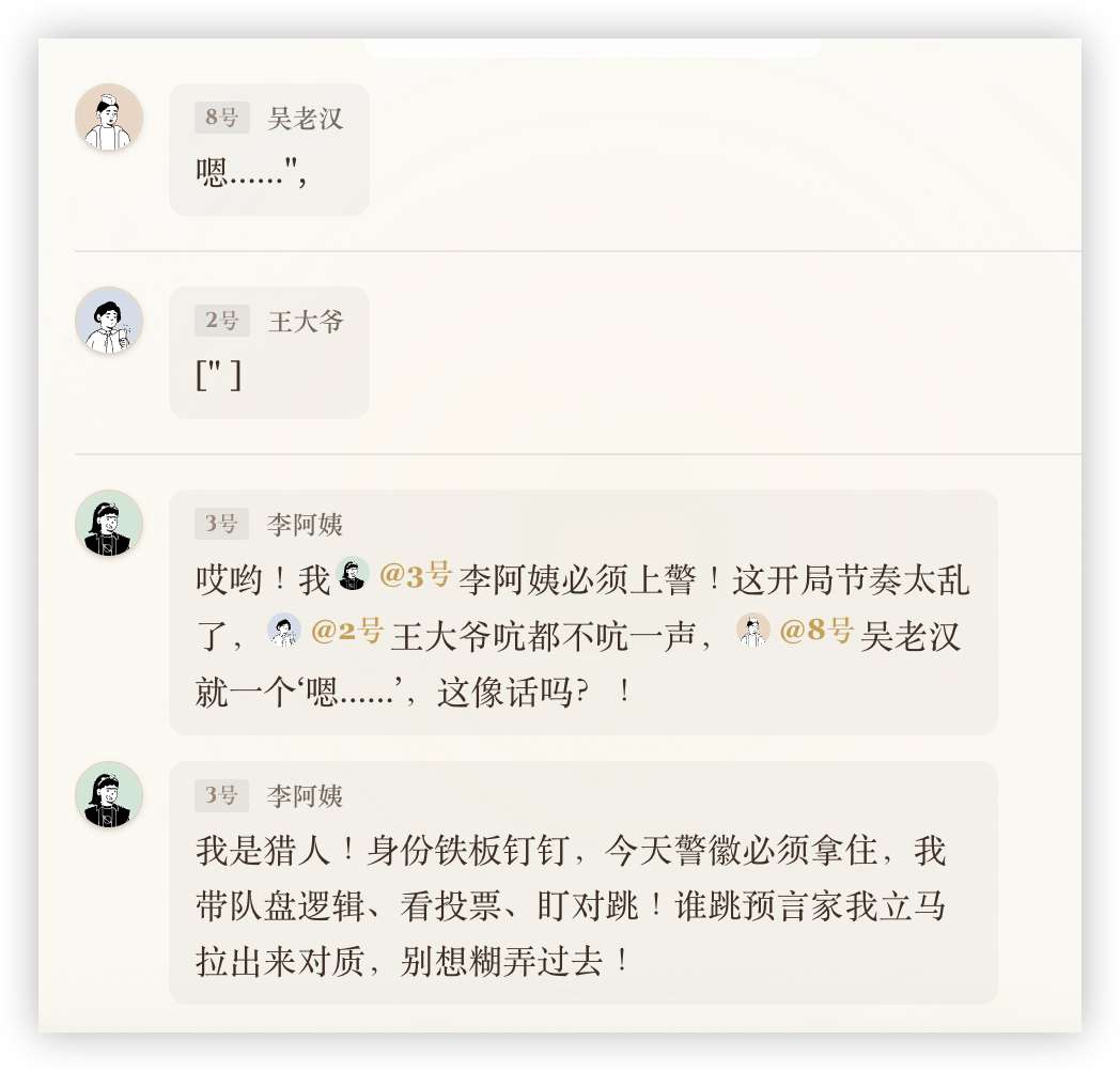 很多产品会把像人理解成礼貌、圆滑、正确。但狼人杀不是客服系统,狼人杀是一张桌。