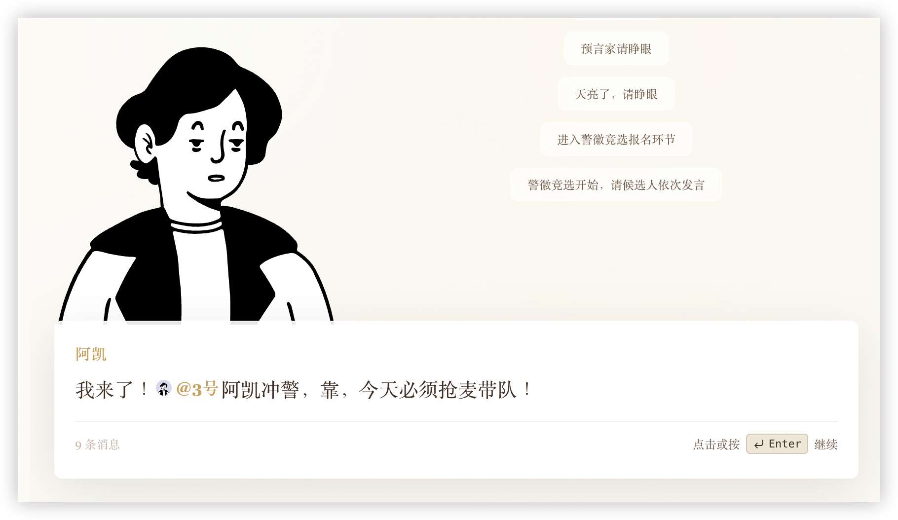 不是我不爱玩,是毕业之后凑齐 8 到 12 个人太难了:时间对不上、地点对不上、状态也对不上。狼人杀当然是社交游戏,但我真正念念不忘的,是只靠只言片语盘出真相的推理快感——以及人在桌上互相试探、互相带节奏、互相嘴硬的那股活气。