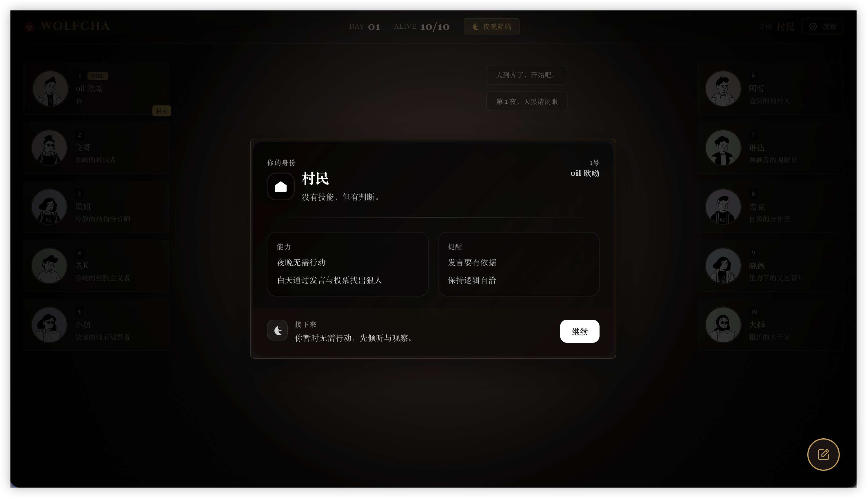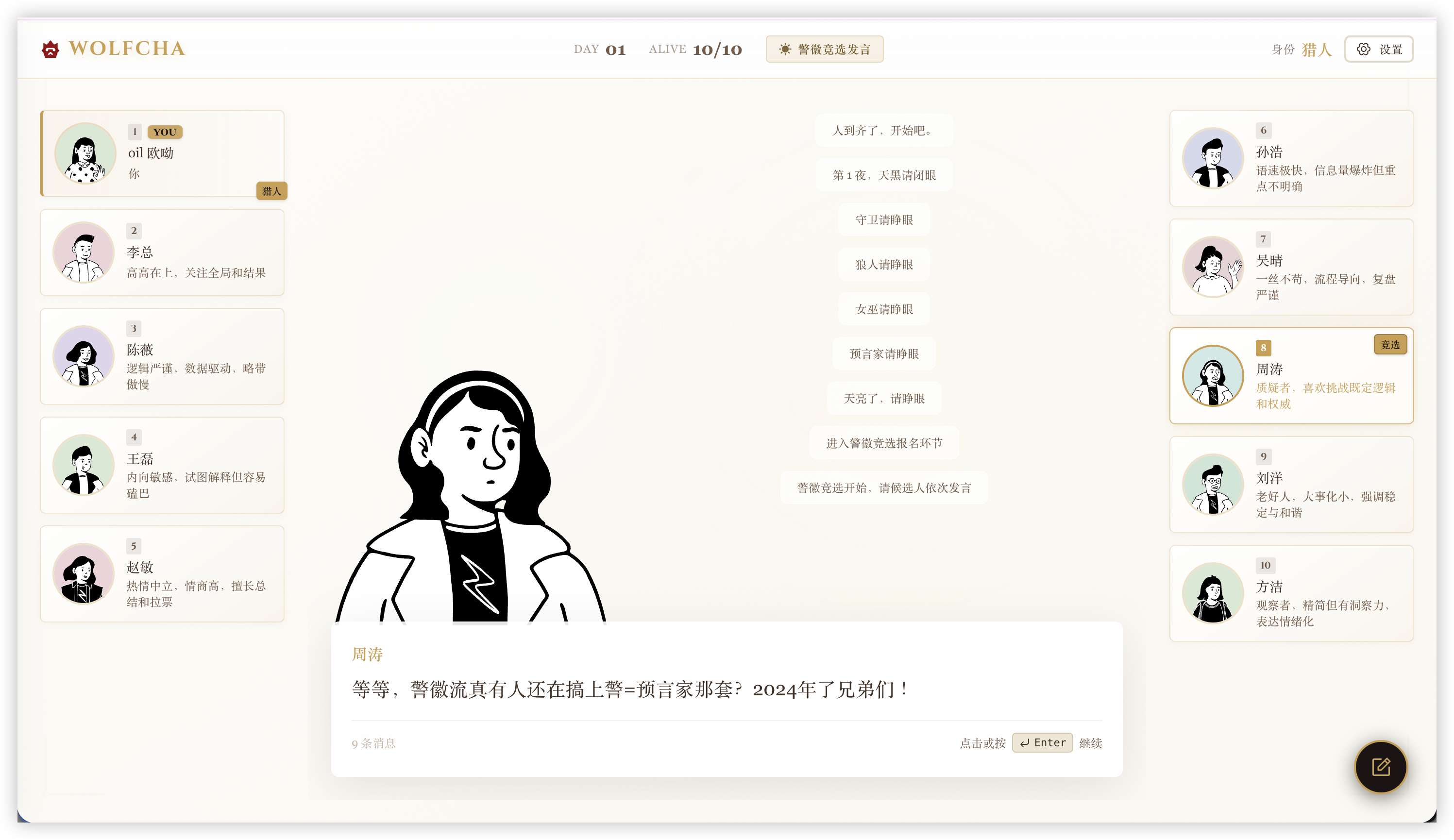 我们一开始就不想做套个身份发言的狼人杀。狼人杀里最迷人的东西,是人。所以我在设计时一直在想一件事:怎么让 AI 先像一个同桌的人,再像一个桌上的角色?