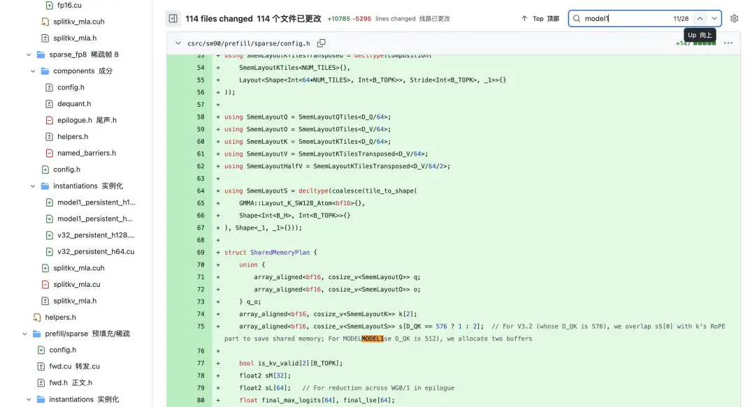 在代码逻辑结构中,「MODEL1」是作为与「V32」(即 DeepSeek-V3.2)并列的独立分支出现的,这一细节意味着「MODEL1」并不共享 V3 系列的参数配置或基础架构,而是一个全新的、独立的技术路径。