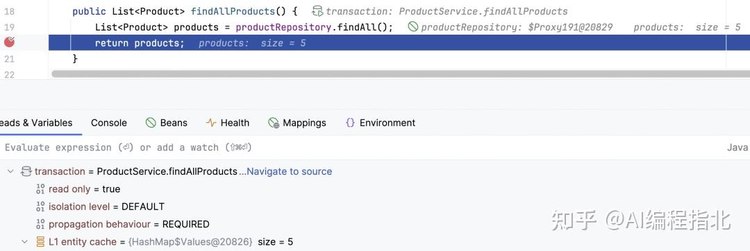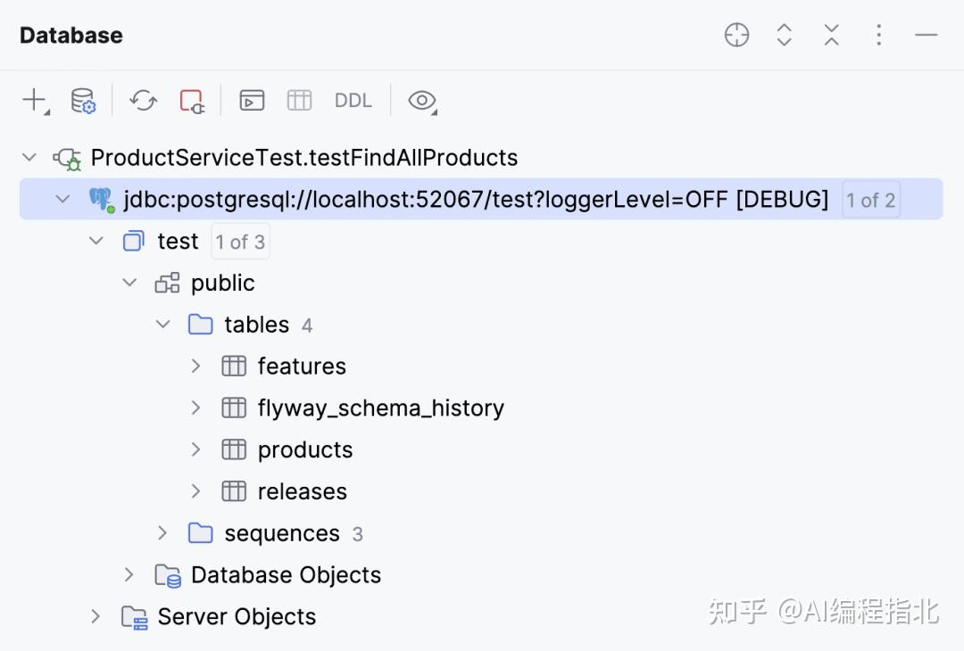 在这种情况下,我们不仅可以看到值,还可以看到来源,并且调试器会显示属性值是如何更新的调用栈。在运行集成测试时,并不总是明显应用连接的是哪个数据库——尤其对于像 Testcontainers 这样的工具,其端口和凭据可能经常变化。通过结合这些功能——Bean 检查、属性追踪、数据库连接检查、事务元数据和实体状态——我们可以全面了解应用在运行时的实际行为。在任何断点处,我们都可以确认实体是否附属于当前