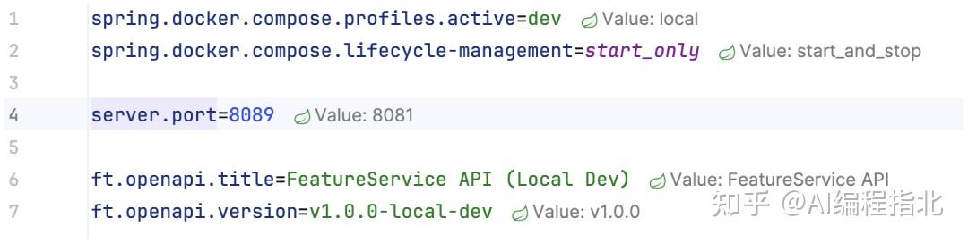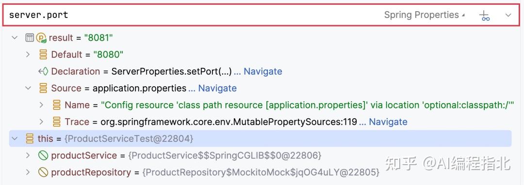 Spring Debugger 会在配置文件中内联显示生效的属性值。点击该值会导航到提供此值的来源,无论是文件还是 Java 代码。
