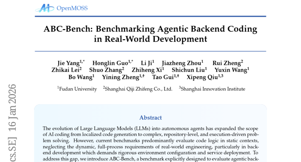 这项由复旦大学、上海齐冀智风科技有限公司和上海创新研究院联合完成的研究发表于2026年1月,论文编号为arXiv:2601.11077v1。研究团队开发了名为ABC-Bench的全新评估基准,专门测试AI代码智能体在真实后端开发场景中的综合能力。
