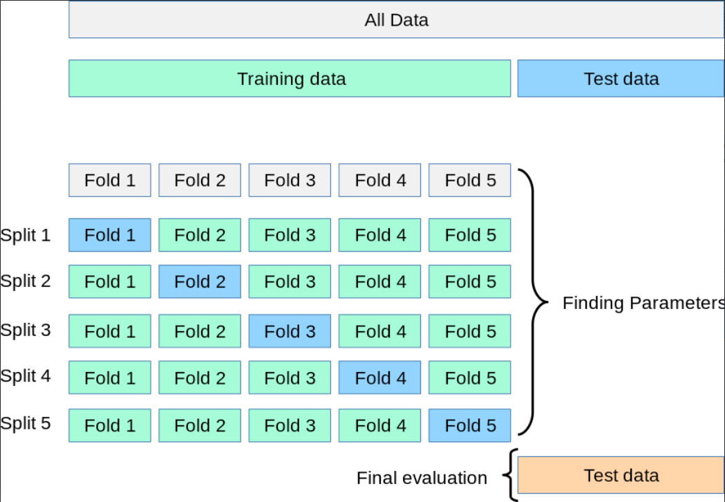 2.随后将Training data 被划分为 k 份(这里是 5 份)将训练数据平均分成 5 个“Fold”(折)