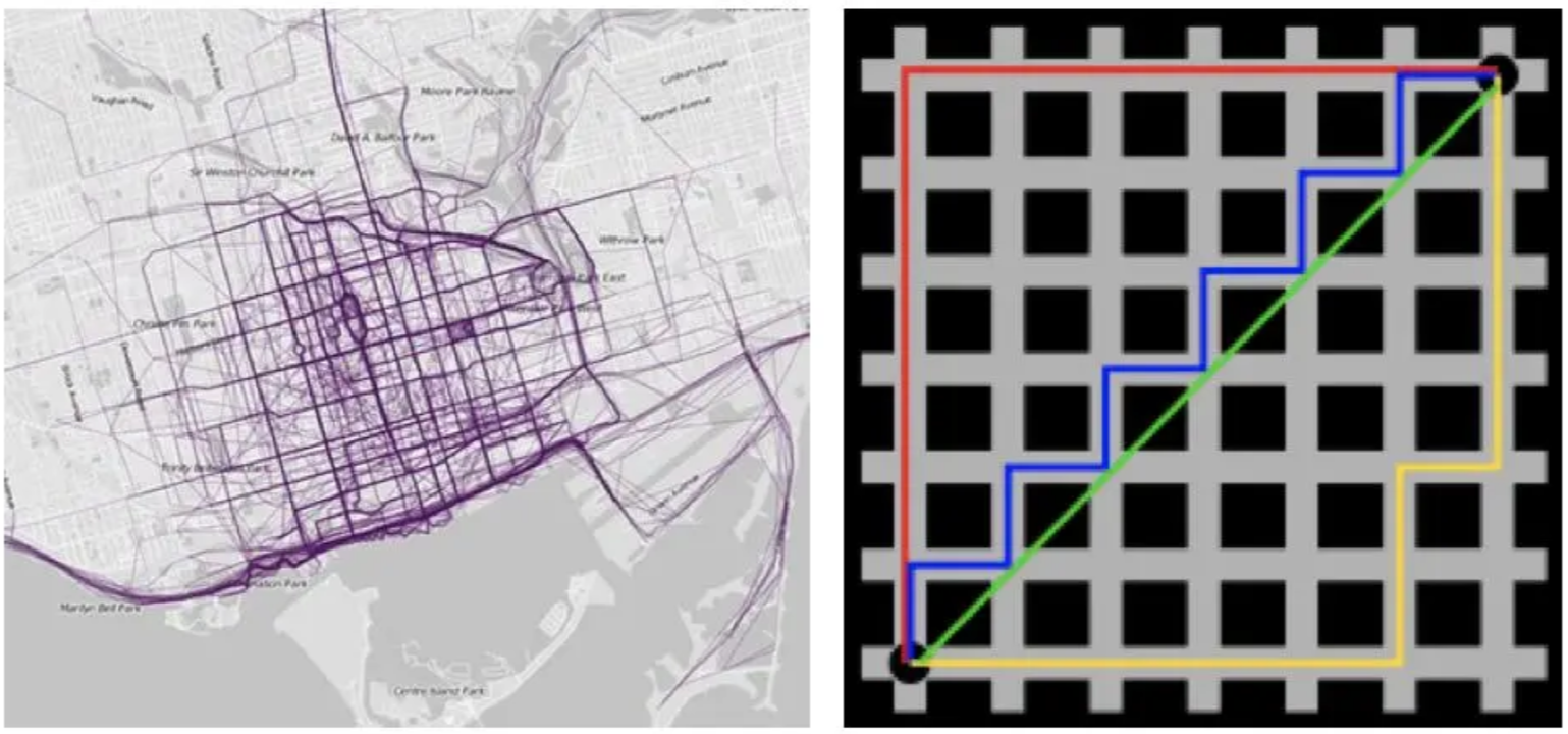 在曼哈顿街区要从一个十字路口开车到另一个十字路口,驾驶距离显然不是两点间的直线距离。这个实际驾驶距离就是“曼哈顿距离”。曼哈顿距离也称为“城市街区距离”(City Block distance)。