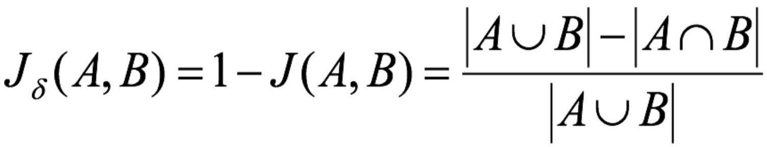 了解到相似度后,我们就可以知道杰卡德距离的数学表示,它使用两个集合中不同元素占所有元素的比例来衡量两个集合的区分度: