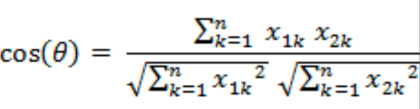 那么我们推广到n维空间中去,假设我们有两个n维样本点a(x11,x12........,x1n)和b(x21,x22..........,x2n),他们间的夹角余弦为: