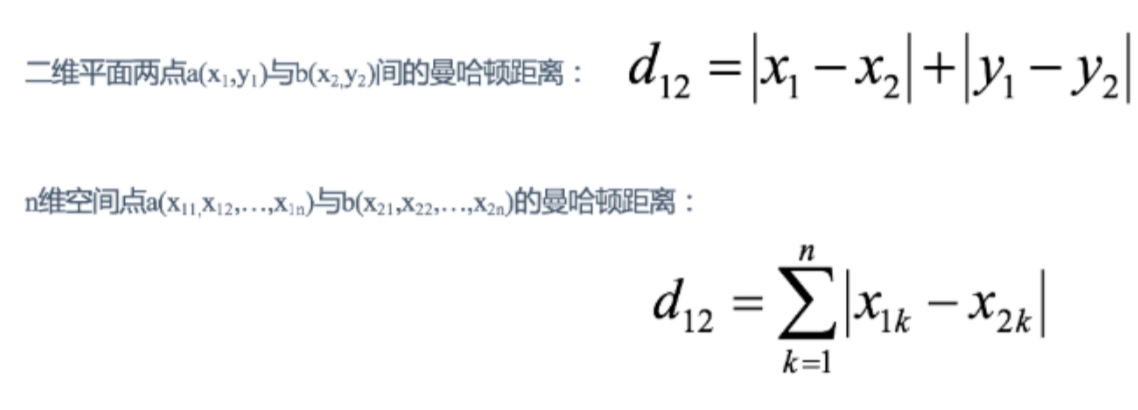 曼哈顿距离是计算两点之间水平线段和垂直线段的距离之和,也称为城市街区距离或L1距离